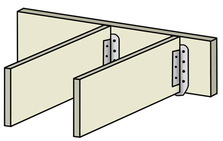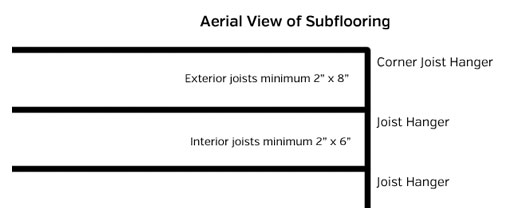 Wooden Sub Flooring: The wooden part of the building starts with wooden floor joists (pressure treated wood). The floor joists are built level onto the pilings. Floor joists are usually 2’x6’, 2’x8’ or 2’x10’. Mine are 2’x10’ in the middle and 2’x12’ exterior. The floor of your building will be similar to the construction of an outdoor deck. Here’s a calculator of the spacing between joists. Mine are 16” apart. Joists are connected to the exterior joists via a metal bracket called a joist hanger; contractors call these “buckets.”